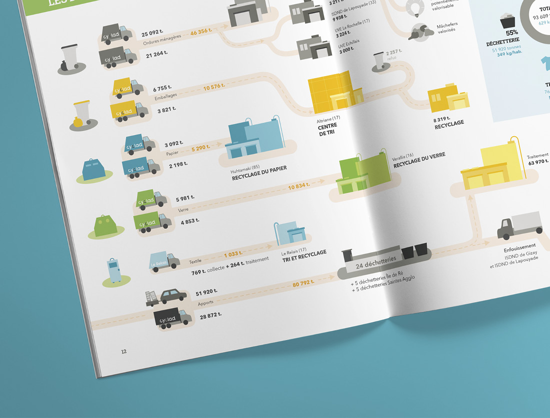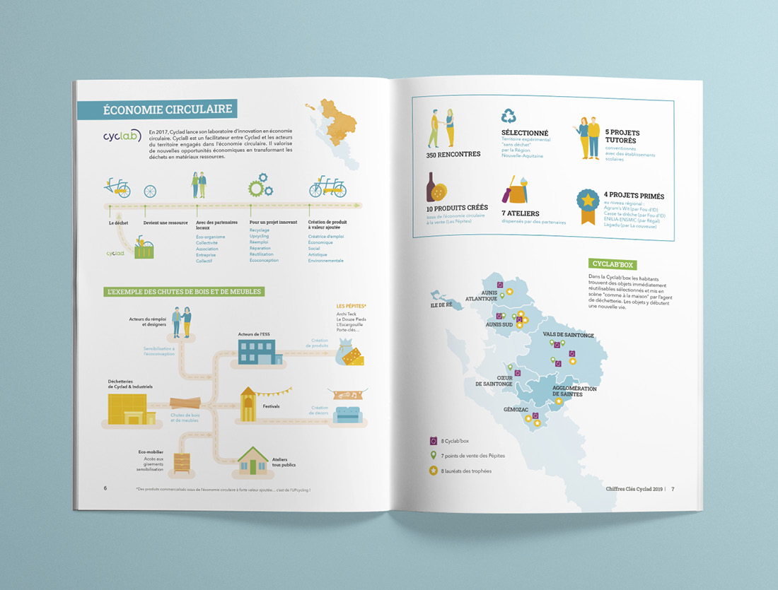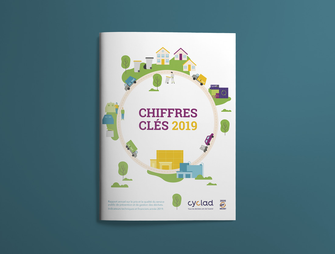 Le syndicat mixte Cyclad exerce une mission de service public de réduction des déchets, de collecte, valorisation et traitement des déchets. Il a choisi Instant Urbain pour la conception de son rapport d’activité sous forme de chiffres clés. Il s’agit d’un rapport annuel sur le prix et la qualité du service public de prévention et de gestion des déchets. Il présente les indicateurs techniques et financiers. L’agence a apporté ses conseils en terme de contenus, de mises en page et de graphisme. Instant Urbain a travaillé à l’aide d’infographies, d’illustrations et de pictogrammes. Instant Urbain a réussi à rendre la lecture intuitive et visuelle sur un document synthétique et accessible.